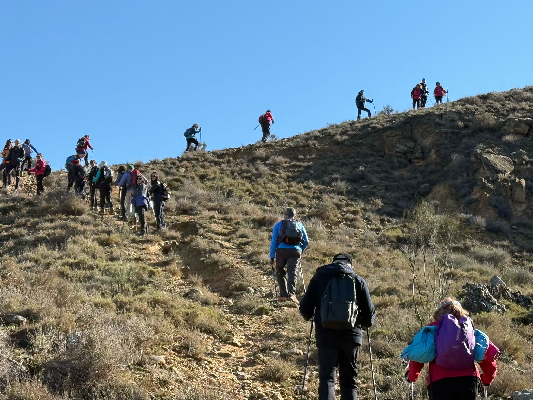 El caminar, muy pausado y siempre a gusto de los marchadores era tan agradable como la cháchara de ida y vuelta con quien se pusiera a nuestro lado. Platicar animadamente o hacer fotos de grupo era lo más parecido a esa felicidad tan deseada al finalizar una semana que a veces se hace muy larga. ¿Es esa felicidad que se repite una y otra vez al coger los bastones y la mochila para echar a andar juntos?. Creo con firmeza que sí. Los días tan buenos y la compañía siempre tan buena son nuestro balón de oxígeno, son un salvavidas para vernos un poco mejor siempre en compañía, sociales y comunicativos.