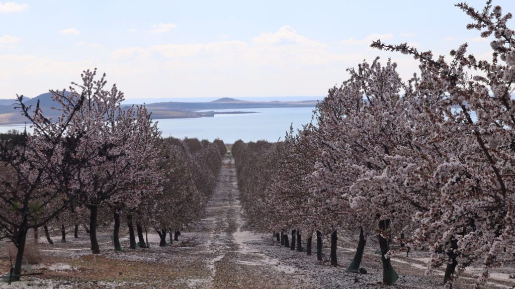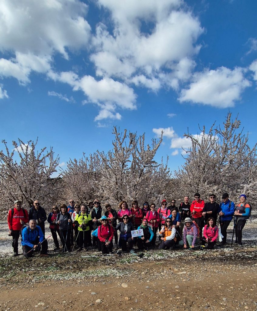 Se me olvidaba decir que por tercera vez gozábamos de un islote de sol entre borrascas sin que el barro molestara demasiado, Al volver a ascender con fuerza aparecían inmensos sasos, mesetas pobladas con almendreras teñidas de un blanco inmaculado por flores y pétalos de plata tanto en ramas como en suelo; era como pasear sobre nieve pero envueltos en un tibio aroma dulce como la miel.